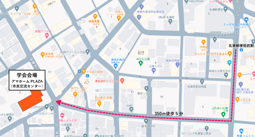 アマホームPLAZA(市民交流センター)へは奄美空港から名瀬郵便局前駅下車、徒歩5分(350m)